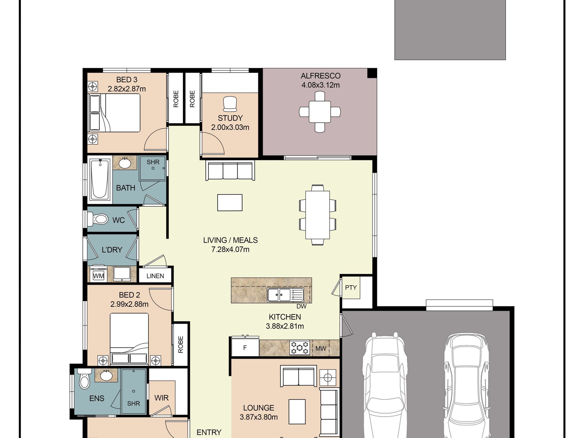 Accommodation is flexible, comprising three bedrooms plus a study or smaller fourth bedroom, all fitted with built-in robes. The main bedroom is complemented by a well-appointed ensuite featuring a large shower with niche and double shower head, while the central bathroom includes a separate bath and a generous shower with niche - ideal for families and guests alike.